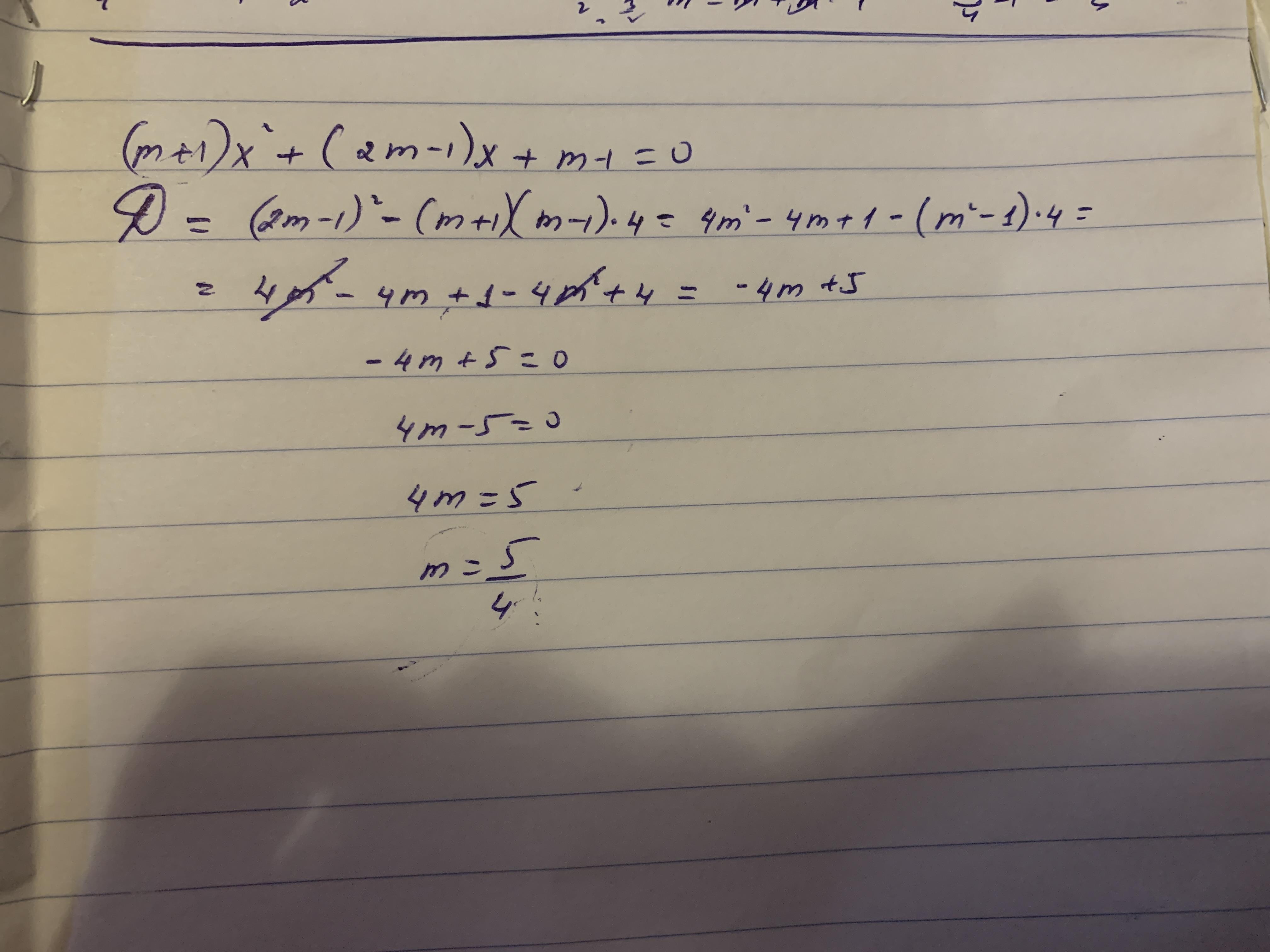 Срочно! При каких значениях m уравнение (m + 1)x²+(2m-1)x+m-1=0 удовлетворяется при единственном значении неизвестного