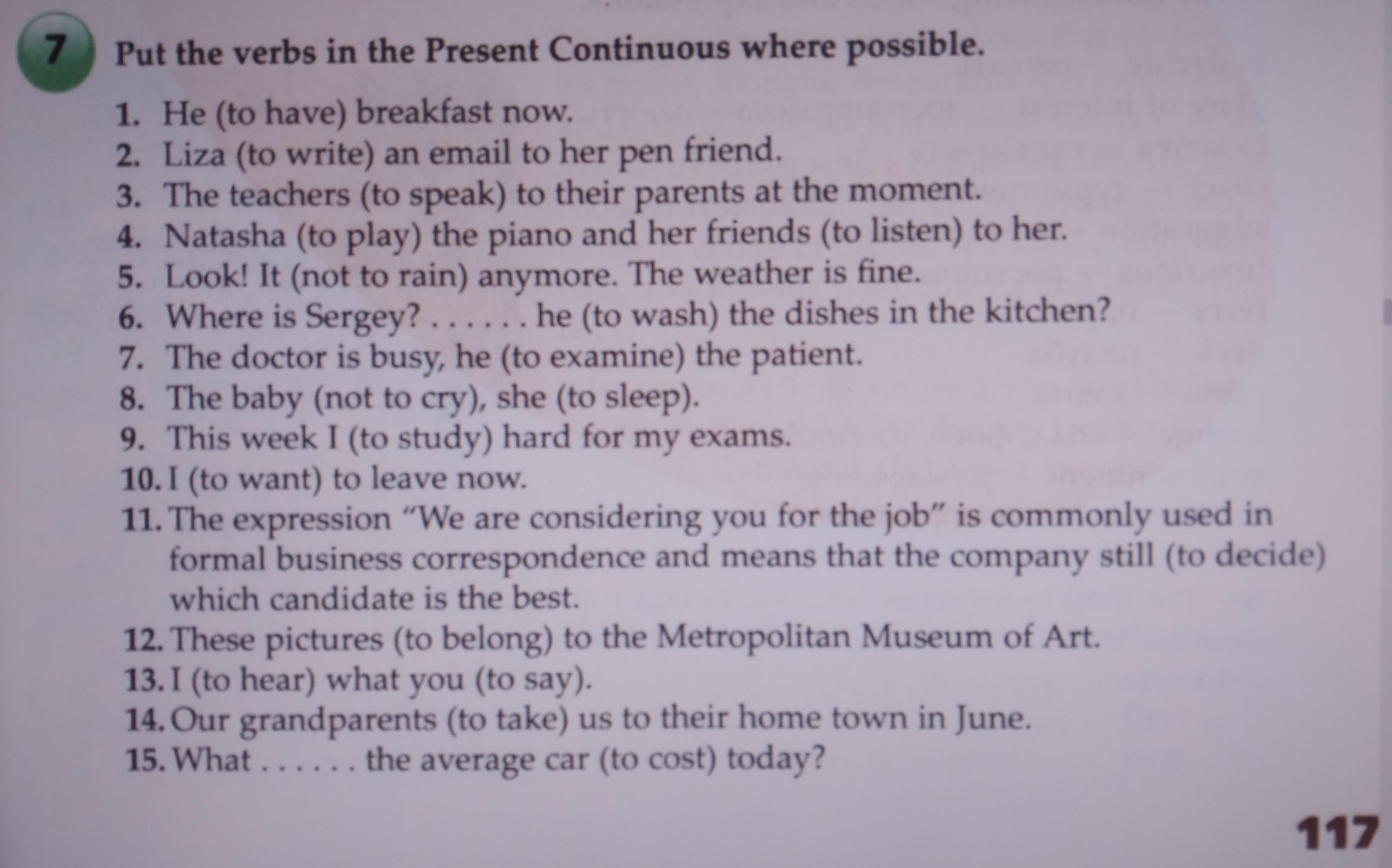 По возможности раскрыть глаголы из скобок в Present Continuous(