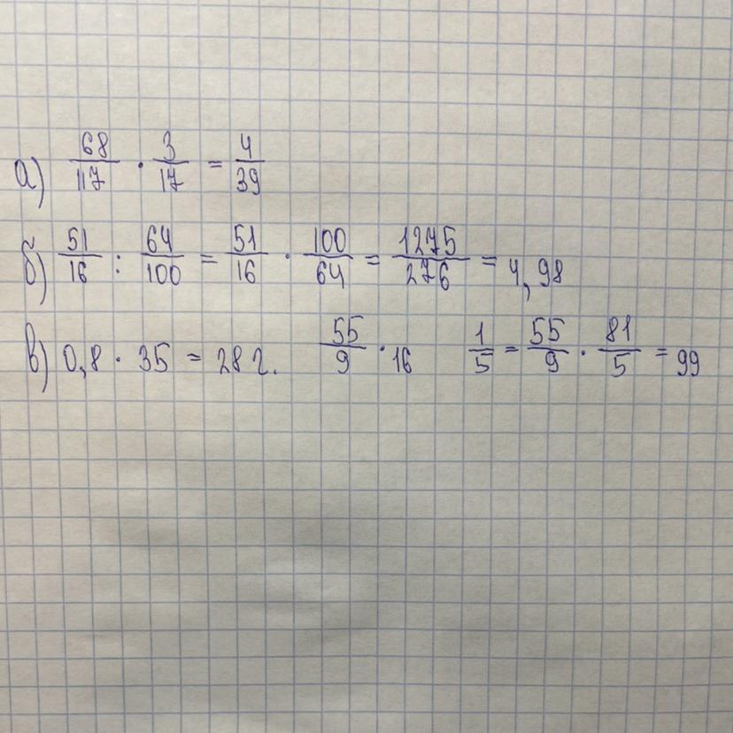 а. 68/117×3/17=4/39; б. 51/16÷64/100=51/16×100/64=1275/256=4,98