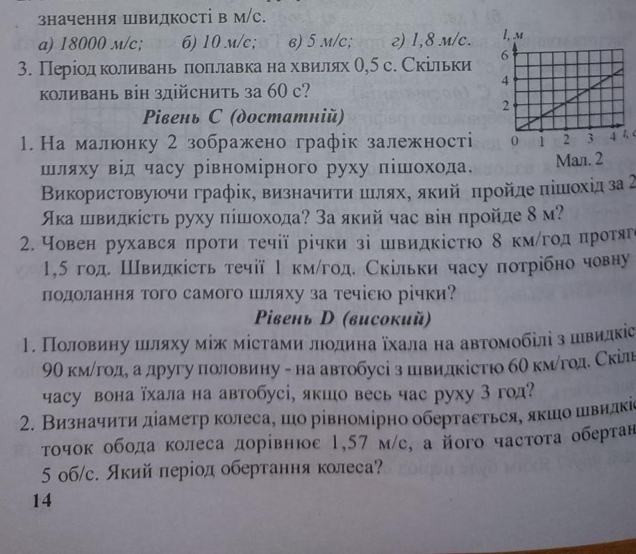 На малюнку 2 зображено графік залежності шляху від часу рівномірного руху пішохода. Використовуючи графік, визначити шлях, який пройде пішохід за 2 с. Яка швидкість руху пішохода? За який час він пройде 8