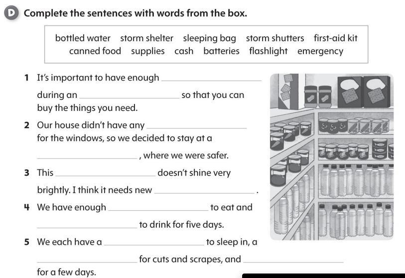 4- canned food, bottled water 5- sleeping bag, first-aid kit, supplies
