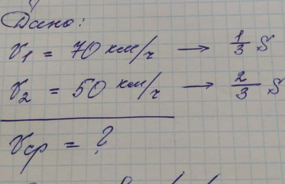 =3/(1/v1 + 2/v2)=3*v1*v2/(v2+2*v1)=3*70*50/(50+2*70)=55.3 км/ч