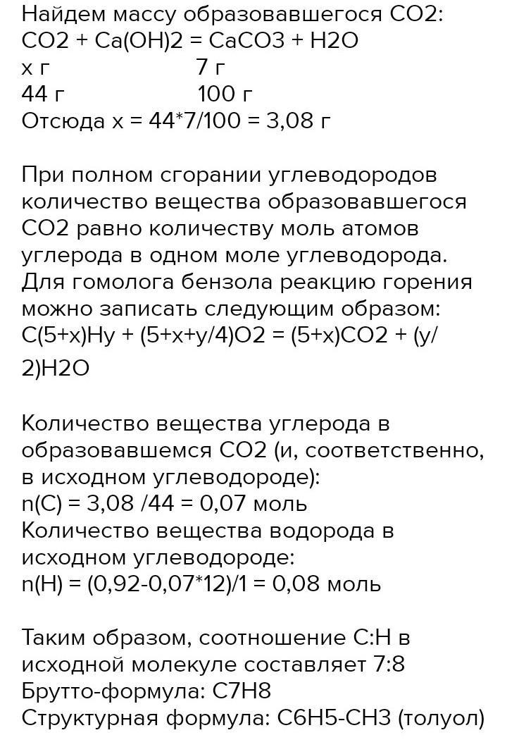 При сжигании 0.92 г гомолога бензола получили СО2, при пропускании которого через избыток известковой воды образуется 7 г остатка. Определите формулу гомолога бензола.