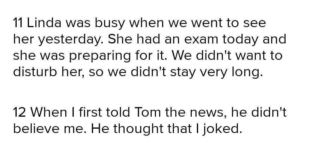 11 Linda was busy when we went to see her yesterday. She had an exam today and she was preparing for it. We didn't want to disturb her, so we didn't stay very long.