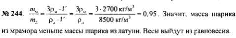 244. На одну чашу весов положили мраморный шарик, на другую шарик из латуни, втрое меньший по объему. Останутся ли весы в равновесии?