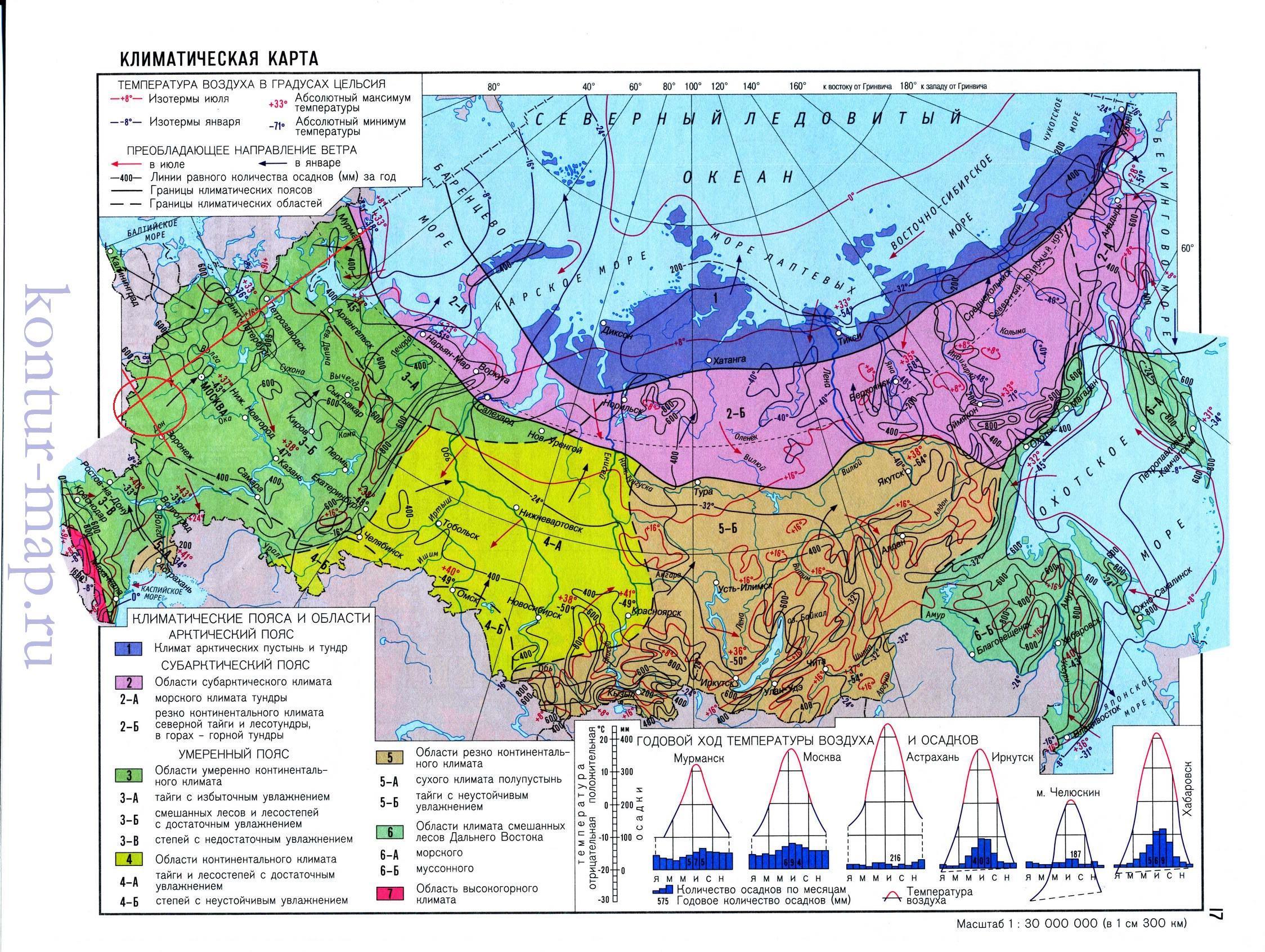 На меридиане 34° и параллели 50° изотермы января будут -8°, а изотермы июля +18°.С севера на юг температуры воздуха будут увеличиваться, что связано с увеличением угла падения солнечных лучей.С запада на восток летние температуры практически не изменяются, а зимние уменьшаются, что связано с нарастанием континентальности климата.