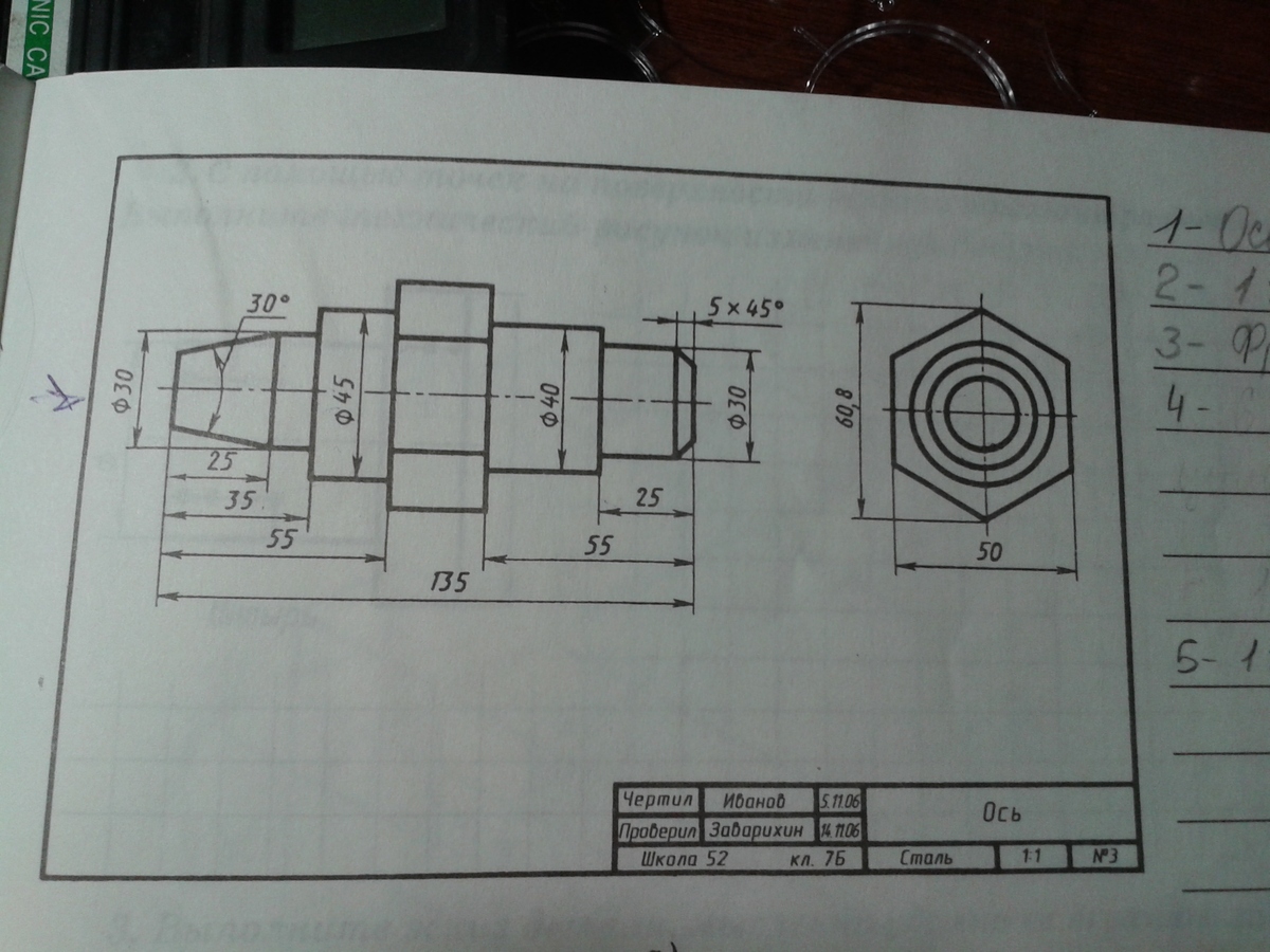 4)на главном виде мы видим проекцию равнобедренной трапеции, а на виде слева проекции в виде окружностей, значит эти проекции имеют форму усеченного конуса. На главн виде мы видим проекции 2-х прямоугольников, а на виде слева проекции окружностей, что имеет форму цилиндра. на главн виде -проекц прямоугольника, а на виде слева проекция правильного шестиугольника , значит имеет формеу шестиугольной призмы. аналогично Ф40 и Ф30-это цилиндры, а 5х45-фаск, имеющаяя форму усеченного конуса.