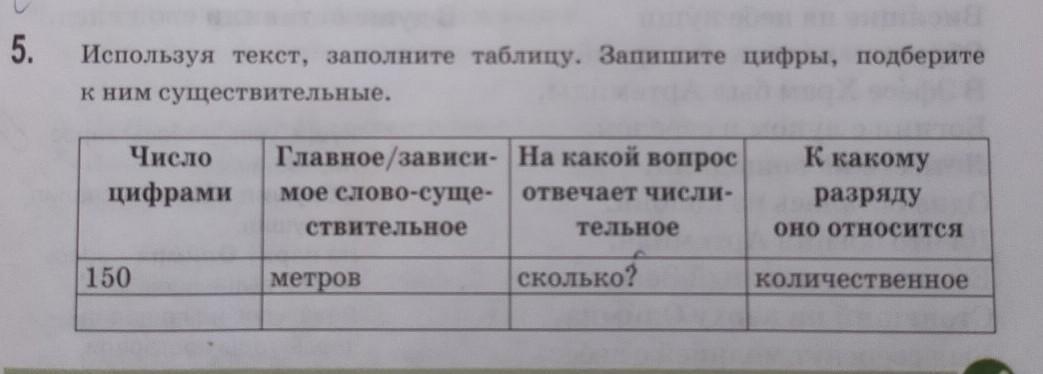 5. Используя текст, заполните таблицу. Запишите цифры, подберите кним существительные, Число цифрами Главное/зависи- На какой вопрос мое слово-суще- отвечает числи- ствительное тельное К какому разряду оно относится сколько? количественное 150 метров