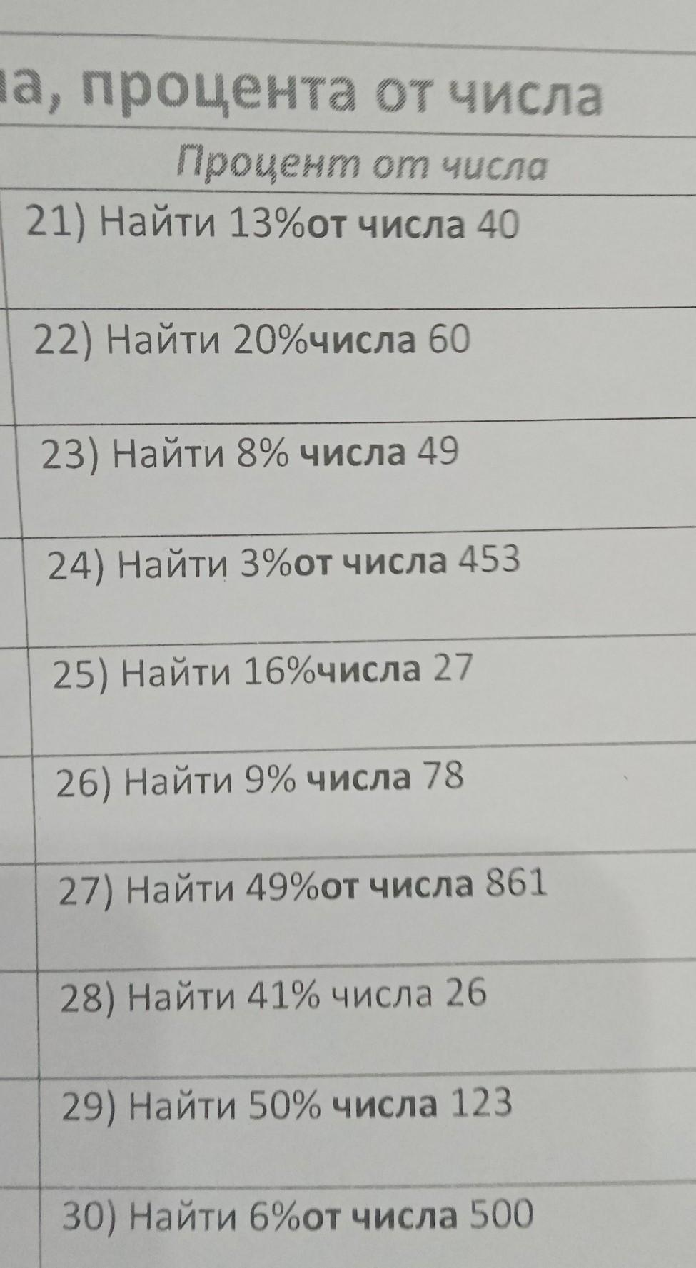 Процент от числа 21) Найти 13%от числа 40 22) Найти 20%числа 60 23) Найти 8% числа 49 24) Найти 3%от числа 453 25) Найти 16%числа 27 26) Найти 9% числа 78 27) Найти 49%от числа 861 28) Найти 41% числа 26 29) Найти 50% числа 123 30) Найти 6%от числа 500