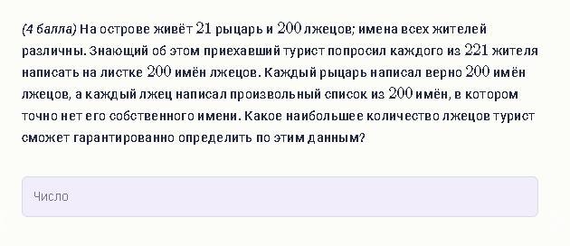 На острове живёт 21 рыцарь и 200 лжецов; имена всех жителей различны. Знающий об этом приехавший турист попросил каждого из 221 жителя написать на листке 200 имён лжецов. Каждый рыцарь написал верно 200 имён лжецов, а каждый лжец написал произвольный список из 200 имён, в котором точно нет его собственного имени. Какое наибольшее количество лжецов турист сможет гарантированно определить по этим данным?