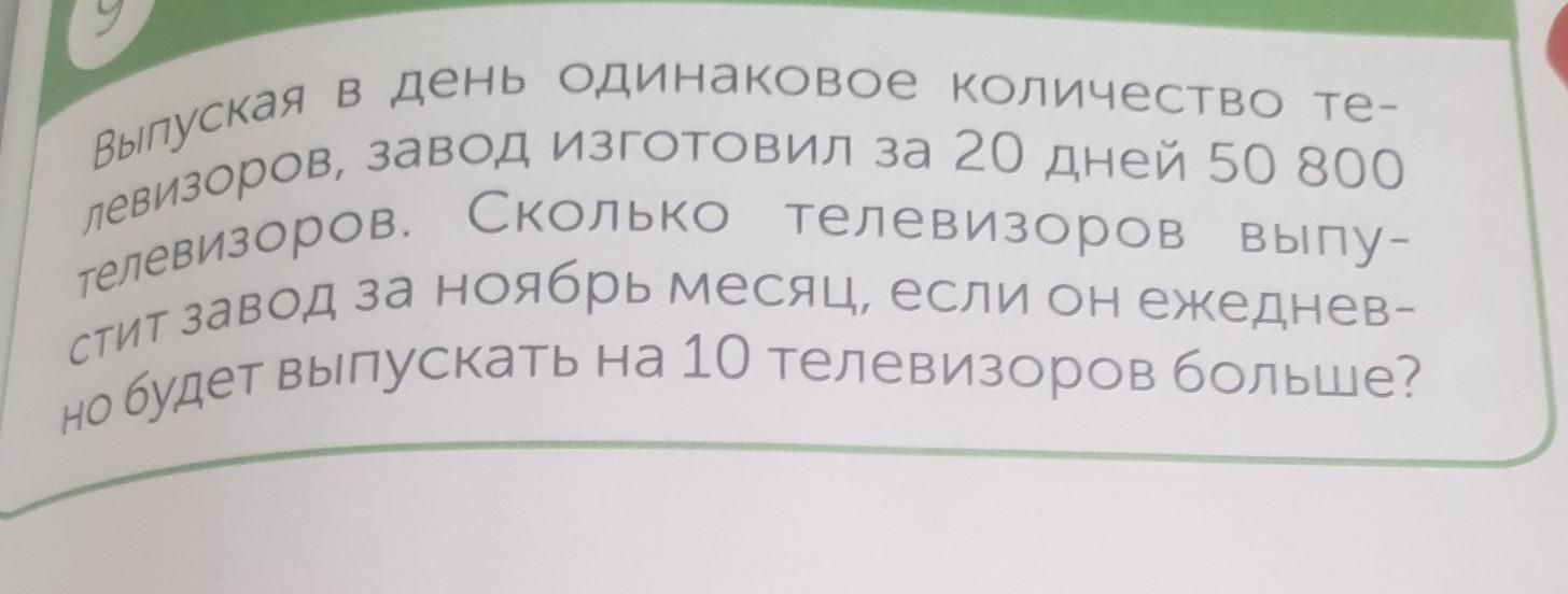 Реши задачу. 9 Выпуская в день одинаковое количество те- левизоров, завОД ИЗГОТОВИЛ за 20 дней 50 800 телевизоров. Сколько телевизоров выпу- стит завод за Ноябрь месяц, если OH ежеднев- но будет выпускать на 10 телевизоров больше? с