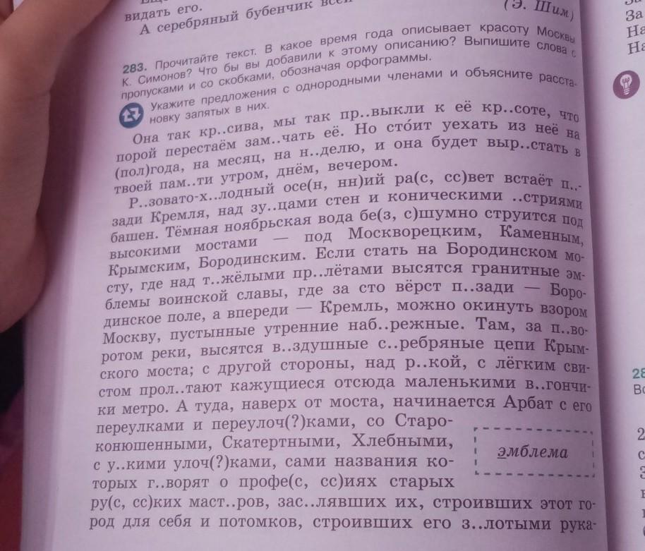 прочитайте текст. в какое время года описывают красоту Москвы К.Симнов? что бы вы добавили к этому описанию? выпишите слова с пропускоми и со скобками, обозначая орфограммы. укажите предложения с однородными члена и и объясните расстановку запятых в них.
