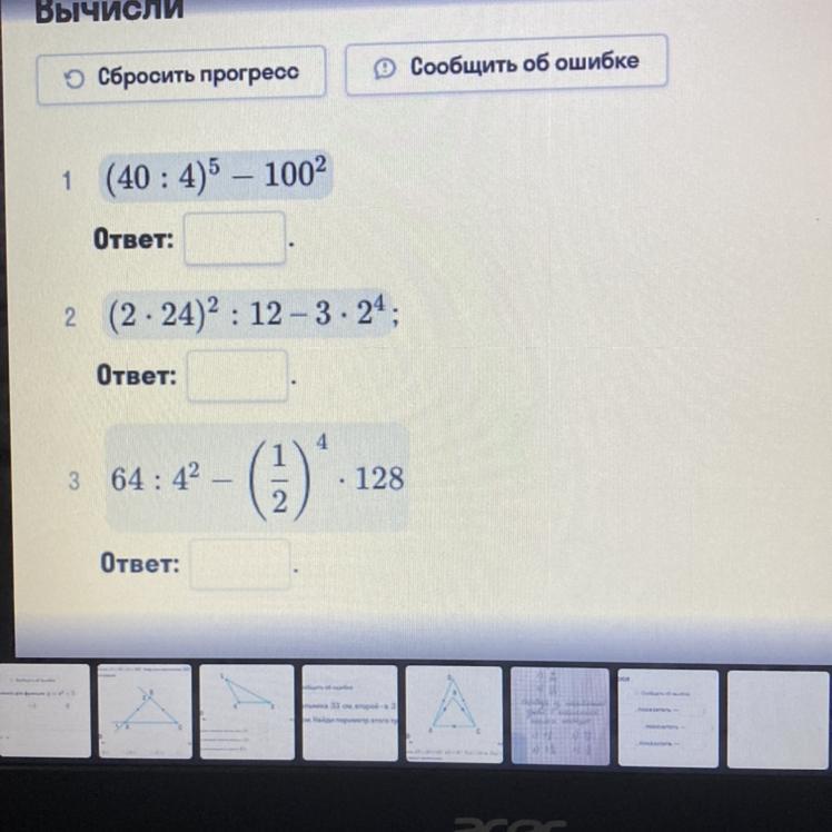 3) 64 : 4 во 2 степени - (1/2) в 4 степени * 128 = 64 : 16 - 1/16 * 128 = 4 - 8 = -4