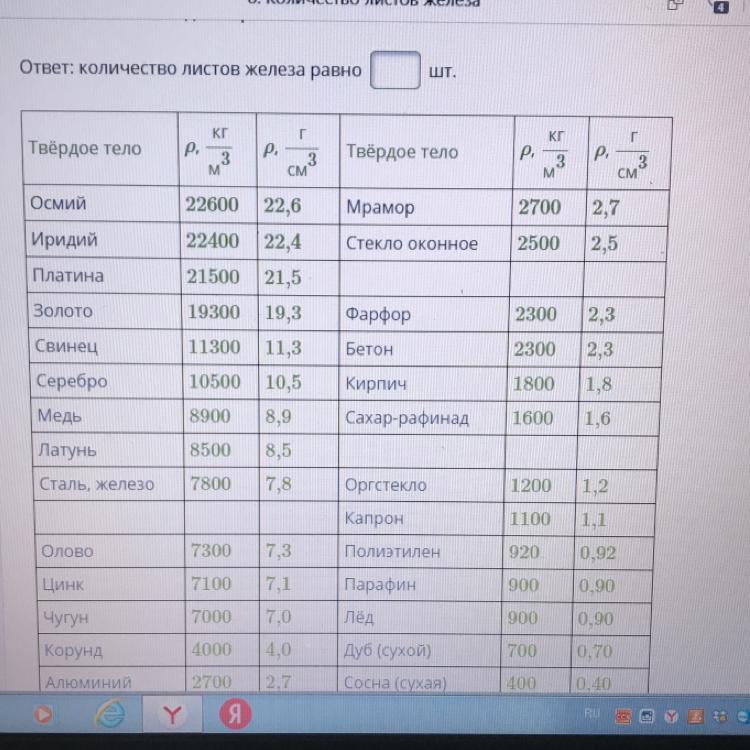 Наибольшая масса груза, который можно перевезти с помощью машины, составляет 6т. Груз состоит из листов железа шириной 80 см, длиной 2,5 м и толщиной 3 мм. Укажи максимальное количество листов для перевозки.
