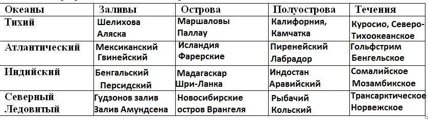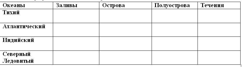 3. Работа с картами. Распределите названия географических объектов в соответствии с их положением в пределах океана. Если нет примера в списке, дополните самостоятельно (2 названия).