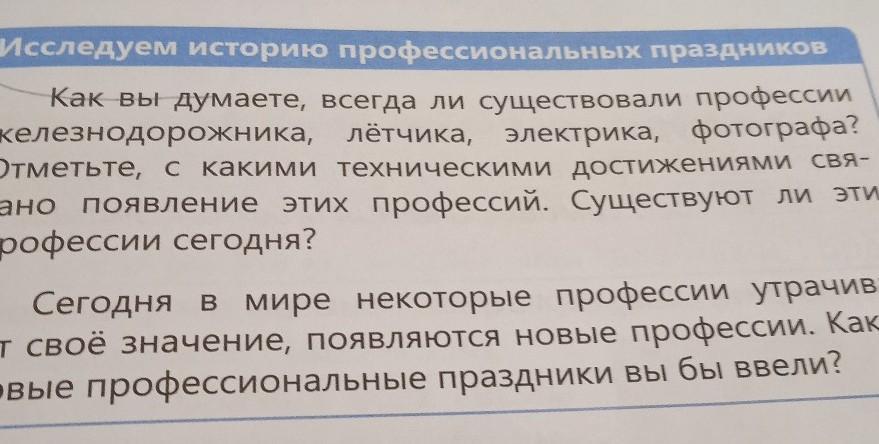 профессиональных праздников, вклассе проведите Конкурс открыток. 2. Исследуем историю профессиональных праздников Как вы думаете, всегда ли существовали профессии железнодорожника, лётчика, электрика, фотографа? Отметьте, с какими техническими достижениями свя зано появление этих профессий. Существуют ли эти профессии сегодня? Сегодня в мире некоторые профессии утрачива- ют своё значение, появляются новые профессии. Какие новые профессиональные праздники вы бы ввели?