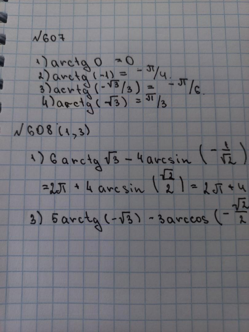 1)0 rad, 2)-0.785398163 rad, 3)arctg(корень (3)/3)=pi/6=30 градусов, 4)10.7260682 rad (номер 607)