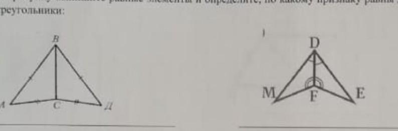 По рисунку выпишите равные элементы и определите по какому признаку равны данные треугольники.
