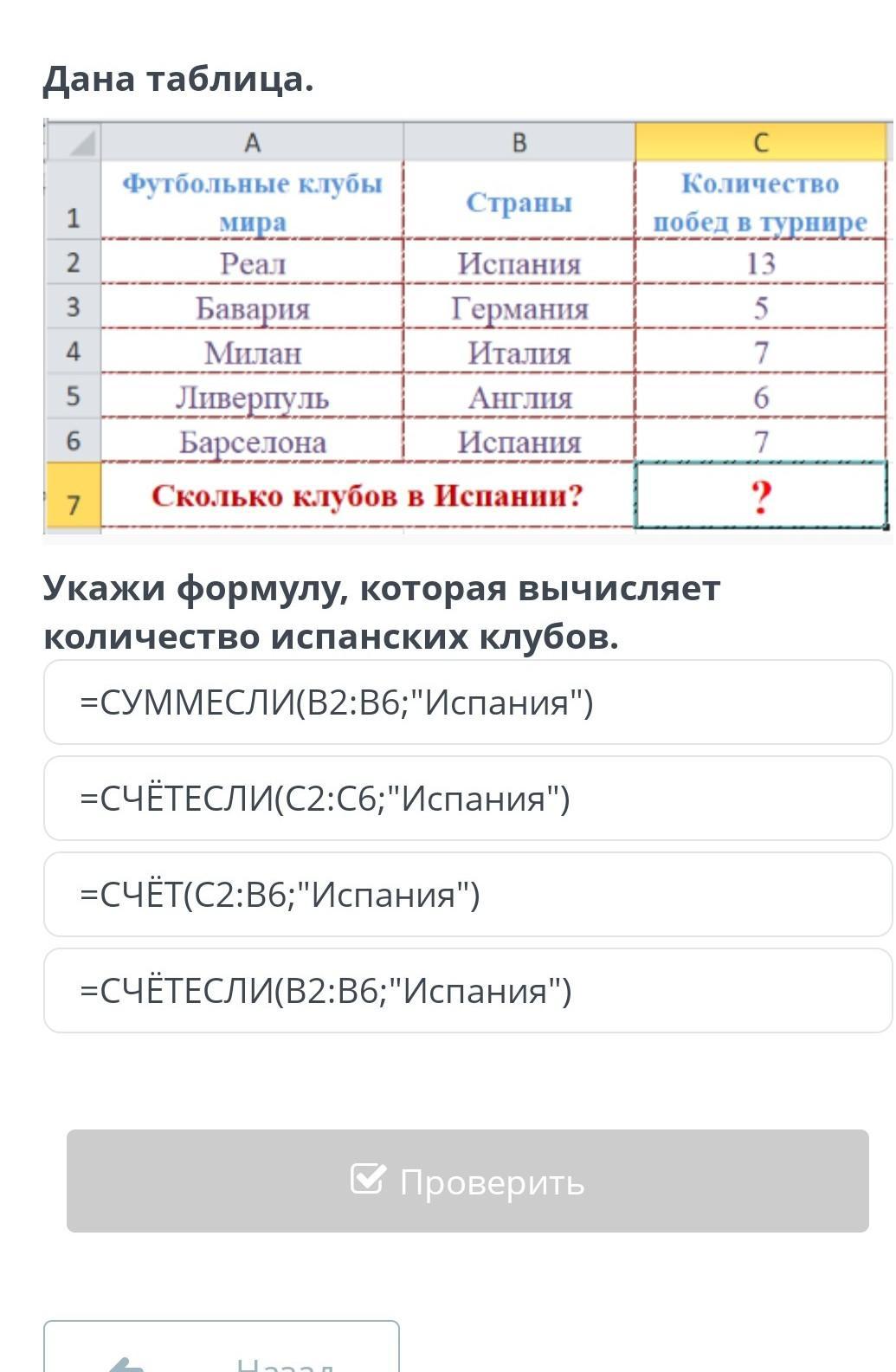 Анализ данных на основе имеющейся информации Дана таблица. с 1 2 A B футбольные клубы Страны мира. Реал Испания Бавария Германия Милан Италия Ливерпуль Англия Барселона Испания Сколько клубов в Испании? Количество побед в турнире 13 5 7 6 3 4 5 6 7 7 ? Укажи формулу, которая вычисляет количество испанских клубов. =СУММЕсли(В2:B6;"Испания") =СЧЁТЕсли(С2:06;"Испания") =СЧЁТ(С2:B6;"Испания") =СЧЁТЕСЛИ(В2:B6;"Испания")