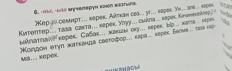 Жерди семиртиш керек.Айткан сөздү угуш керек.Унду элеш керек.Китептерди таза сакташ керек.Сабакты жакшы окуу керек.Ырды жатташ керек.Жрлдон өтүп жатканда светофорду караш керек. Бөлмөнү таза кармаш керек.
