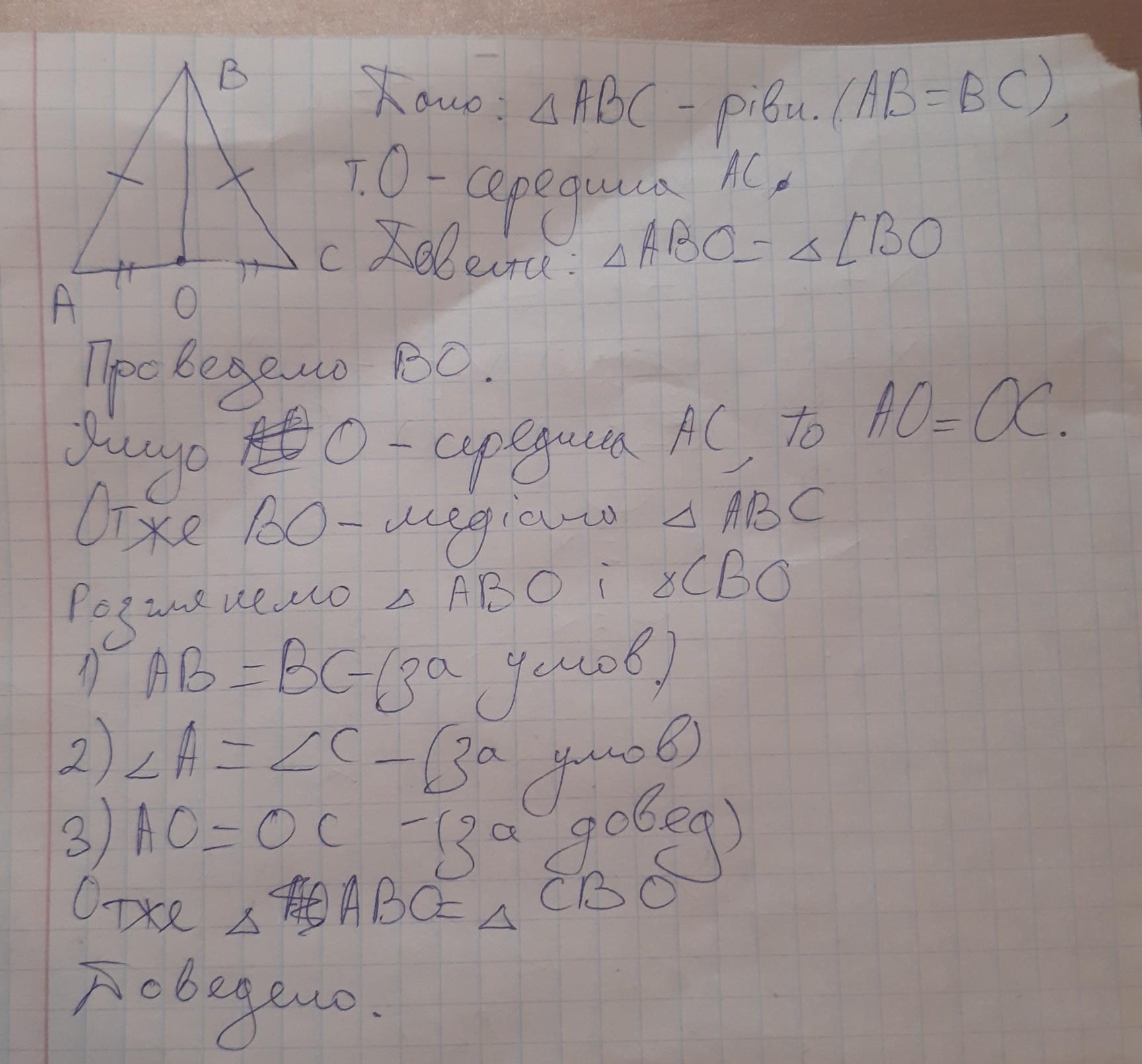 Дан равнобедренный треугольник ABC с основанием AC,О середина отрезка AC, Докозать что треугольник ABO равен треугольнику CBO