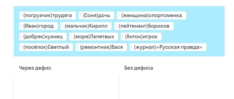 Ответ:Погрузчик-трудяга, дочь Соня, жена спортсменка, Иван город, Мальчик Кирилл, Лейтенант Борисов, Кузнечик добряк, море Лаптевых, Антон-игрок, посёлок Светлый, ремонтник-Вася, журнал "Русская правда" Вроде если что-то не так пиши)