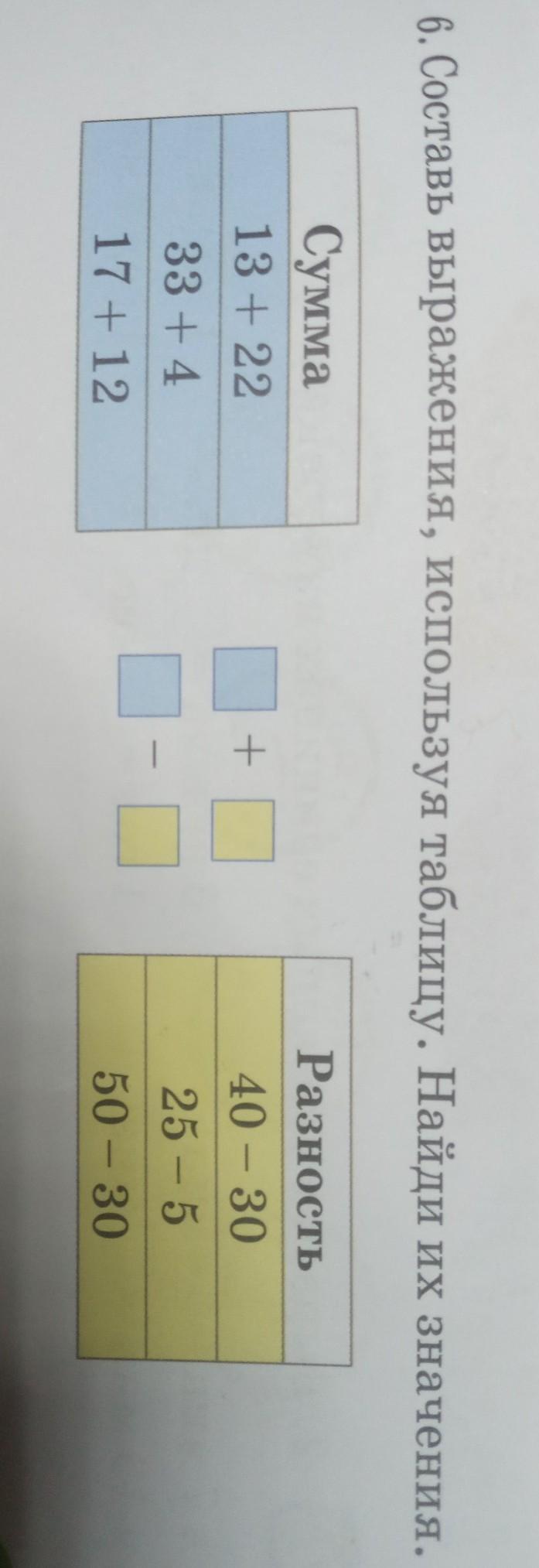 6. Составь выражения, используя таблицу. Найди их значения. + + Сумма 13 + 22 33 +4 17 +12 Разность 40 - 30 25 - 5 50 - 30