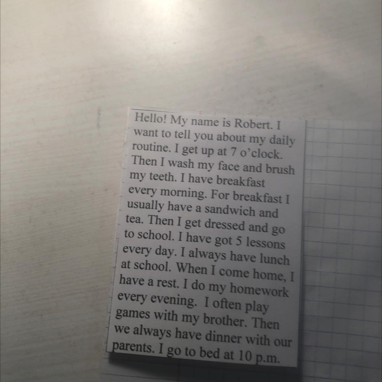 Hello! My name is ___. I want to tell you about my daily routine. I get up at 8 o clock. Then I clean my teeth and have a shower. I have breakfast every morning. For breakfast I usually have toast and cup of tea. Then I dressed and go to school. Usually I have got 5 lessons. I always have lunch at school. When I come home I have a rest. I often play games with my family, then I do my homework and have big dinner. Then I wash my face and do to bed at 10 o clock