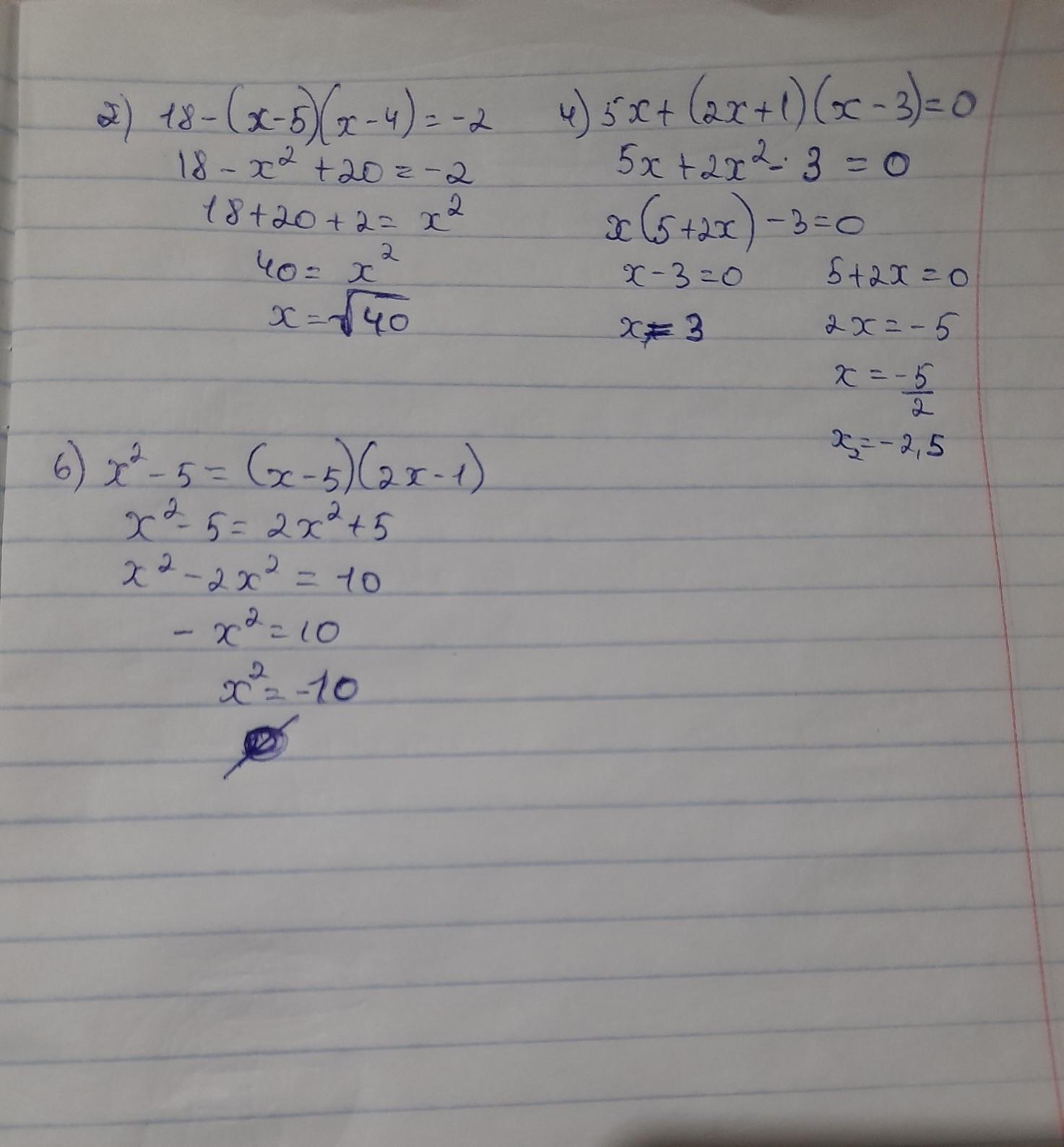 2) 18 - (x - 5)(x – 4)= -2; 4) 5x + (2x + 1)(x – 3) = 0; C + 30; 6) x2 – 5 = (x – 5)(2x – 1). - - -