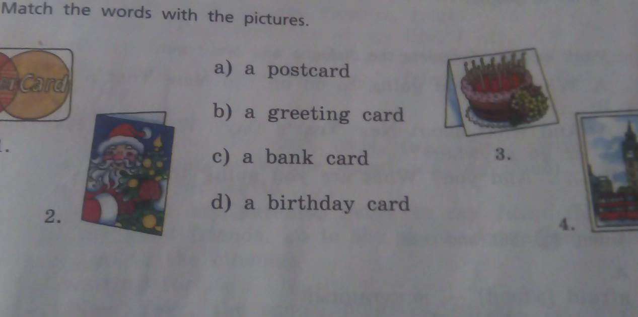 Match the words with the pictures. a) a postcard. b) a greeting card. c) a bank card. d) a birthday card.