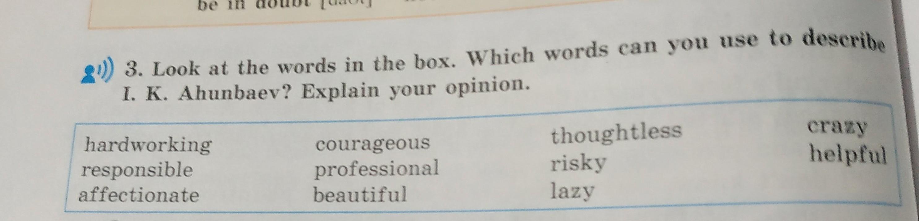 3. Look at the words in the box. Which words can you use to describe I K. Ahunbaer? Explain your opinion. hardworking responsible affectionate courageous professional beautiful thoughtless risky lazy crazy helpful