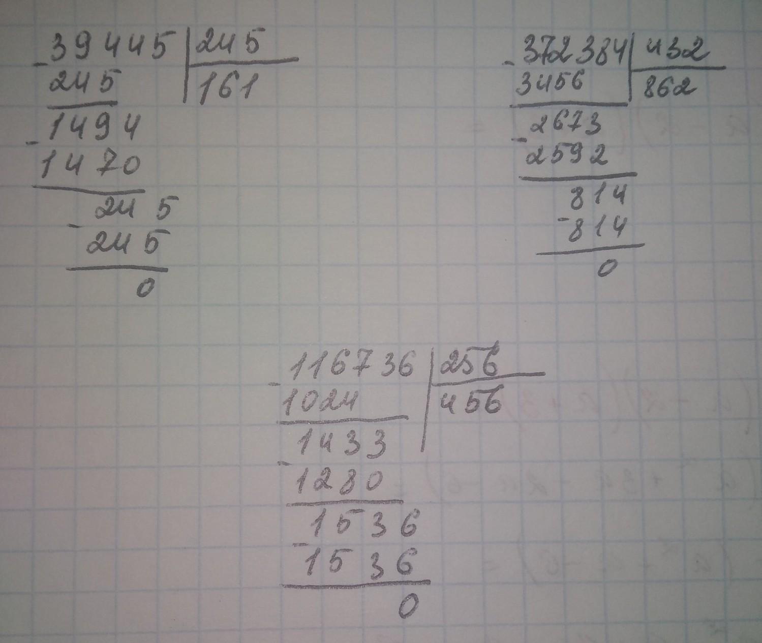 1)39 445:245=161; 2)372 384: 432=862; 3)116 736: 256=456.