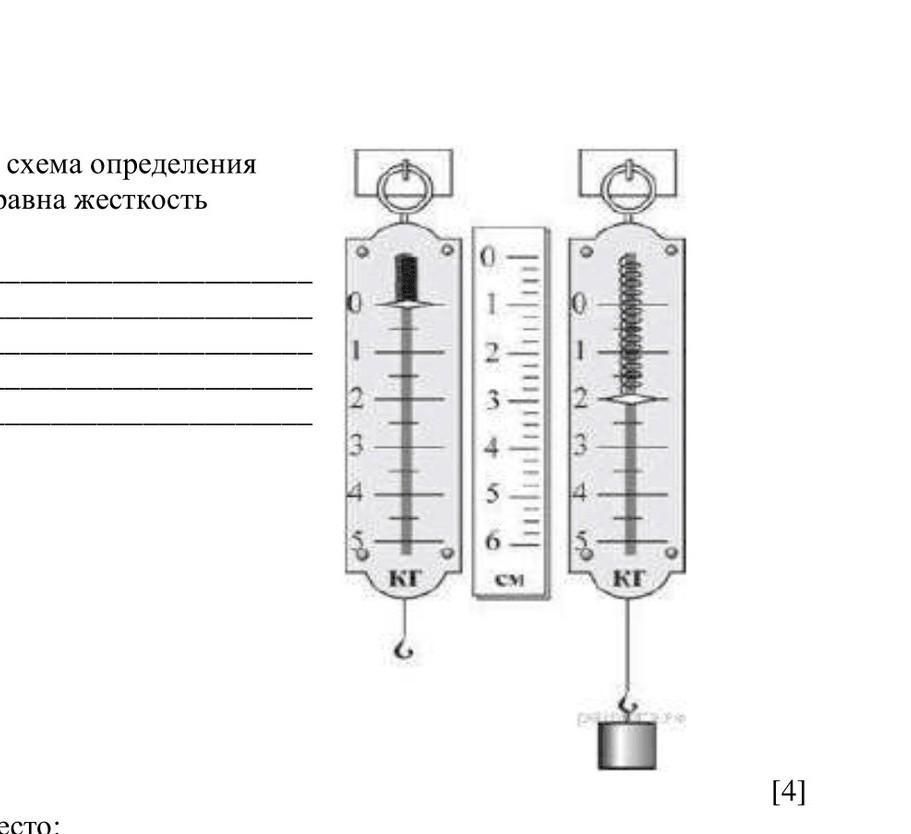 Исходя из данных на схеме мы можем утверждать, что удлинение пружины составило 2 см (2 * 10^-2 м), а сила упругости равна 20 Н (так как масса тела 2 кг и его вес = 2 * 10 = 20 Н). Соответственно, жесткость пружины составит F/Δl = 20/2 * 10^-2 = 1000 Н/м