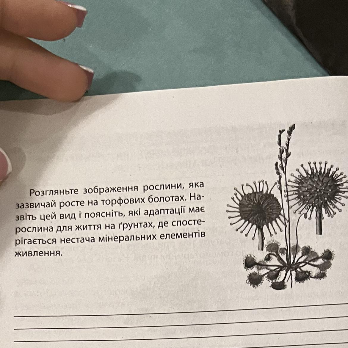 Рассмотрите изображение растения, обычно растущего на торфяных болотах. Отчитайте этот вид и объясните, какие адаптации имеет растение для жизни на почвах, где наблюдается нехватка минеральных элементов Питания.