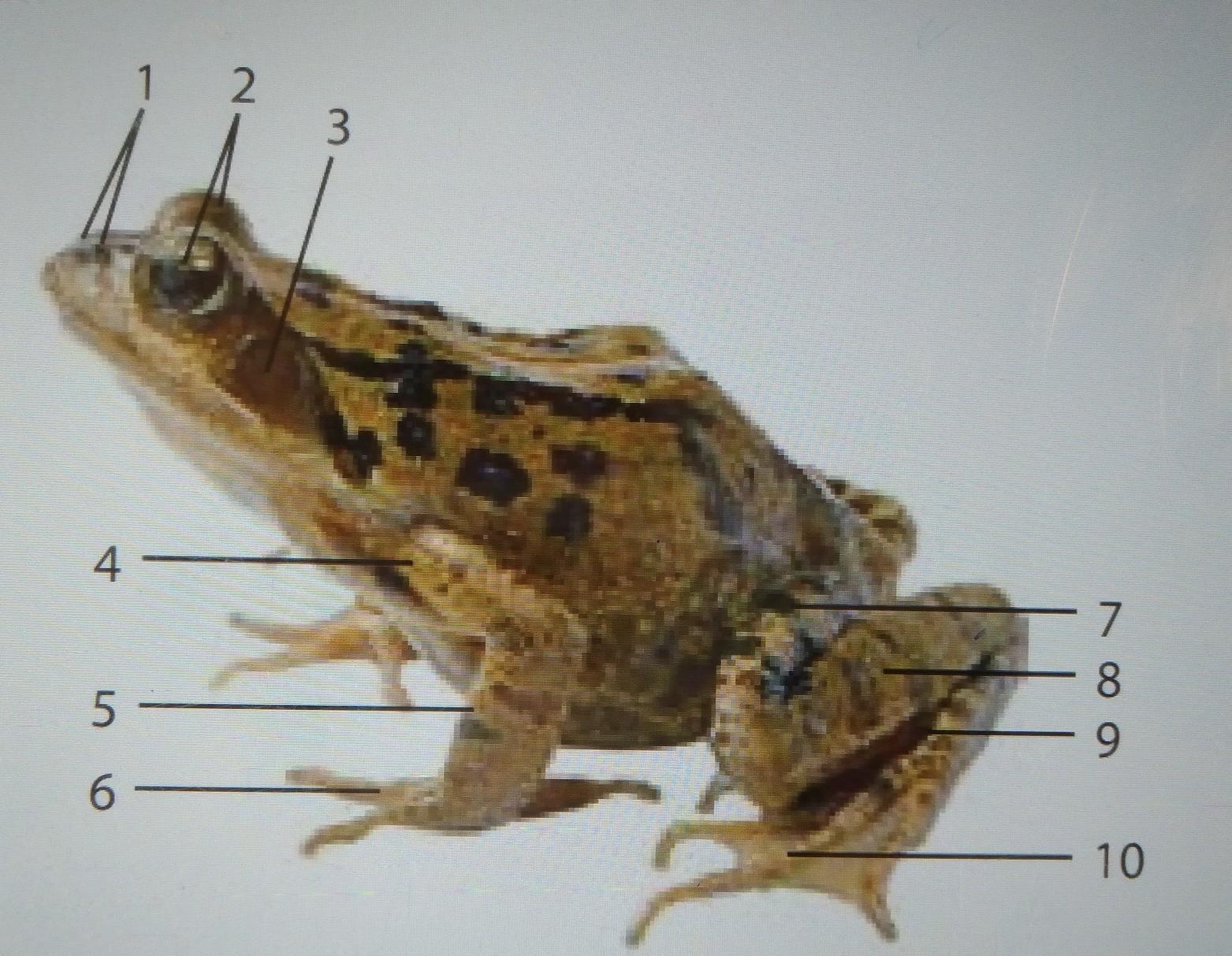 Визначте назви позначених на малюнку основних елементів зовнішньої будови жаби.