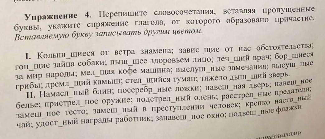 1. Колышущиеся (1) от ветра знамена, зависящие (2) от нас обстоятельства, гонящие (2) зайца собаки, пышущее (1) здоровьем лицо, лечащий (2) врач, борющиеся (1) за мир народы, бреющий (1) полёт, полющие (1) сорняки девушки, мелющая (1) кофе машина, машущая (1) крыльями мельница, недорого стоящие (2) книги.