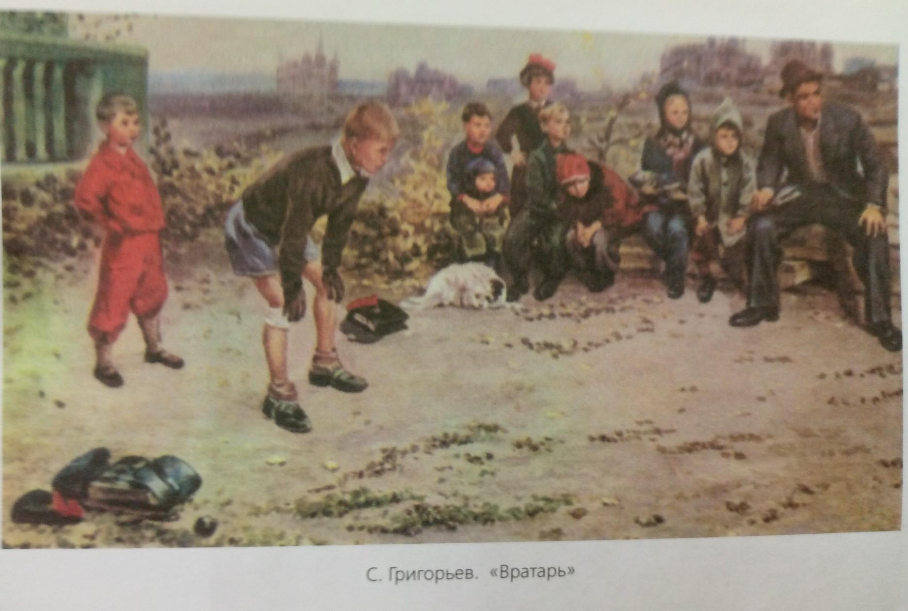 На картине художника С.Григорьева «Вратарь» изображены зрители и вратарь во время игры в футбол. На переднем плане картины мы видим мальчика, по его виду понятно, что он вратарь. Лицо мальчика очень сосредоточено на игре, возможно, мяч приближается к воротам. У вратаря забинтована нога, это говорит о том, что мальчик регулярно играет в футбол. На вид ему лет двенадцать. Возможно, в будущем он станет хорошим футболистом. За вратарём стоит другой мальчик, он немного помладше. Видно, что он возмущён тем, что его не приняли в команду. Лицо у него надутое, вместо того, чтобы сидеть с другими зрителями, он уверенно стоит на поле.