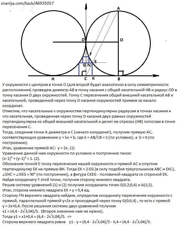Сторону FN верхнего квадрата найдем, определив координату пересечения окружности с прямой, параллельной прямой y=2x и проходящей через точку G(0;0,4) , то есть с прямой