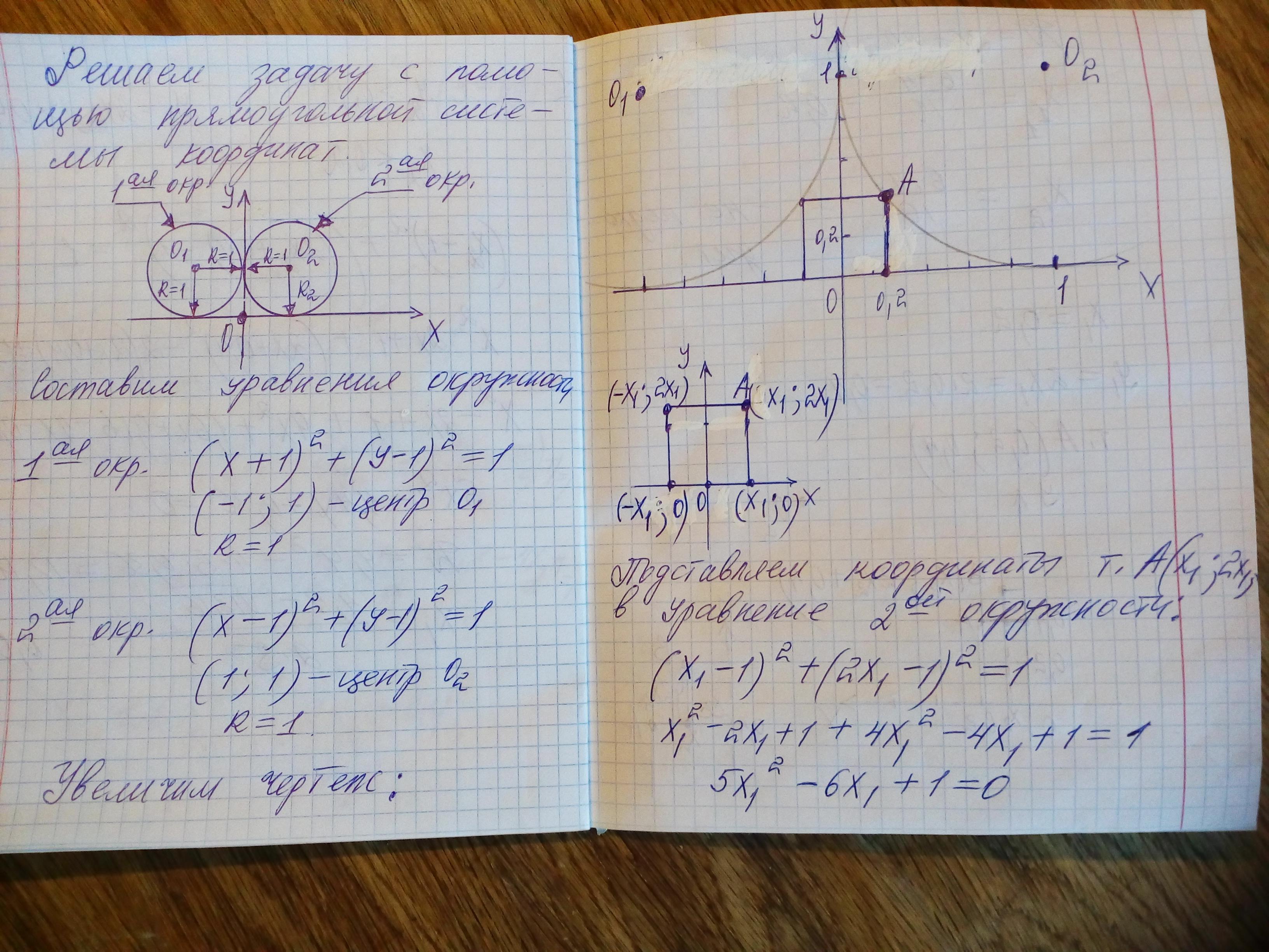 У окружности с центром в точке О (для второй будет аналогично в силу симметричности расположения) проведем диаметр АВ в точку касания с общей касательной НВ и радиус OD в точку касания D двух окружностей. Точку С пересечения общей внешней касательной АВ и касательной, проведенной через точку D касания окружностей примем за начало координат.