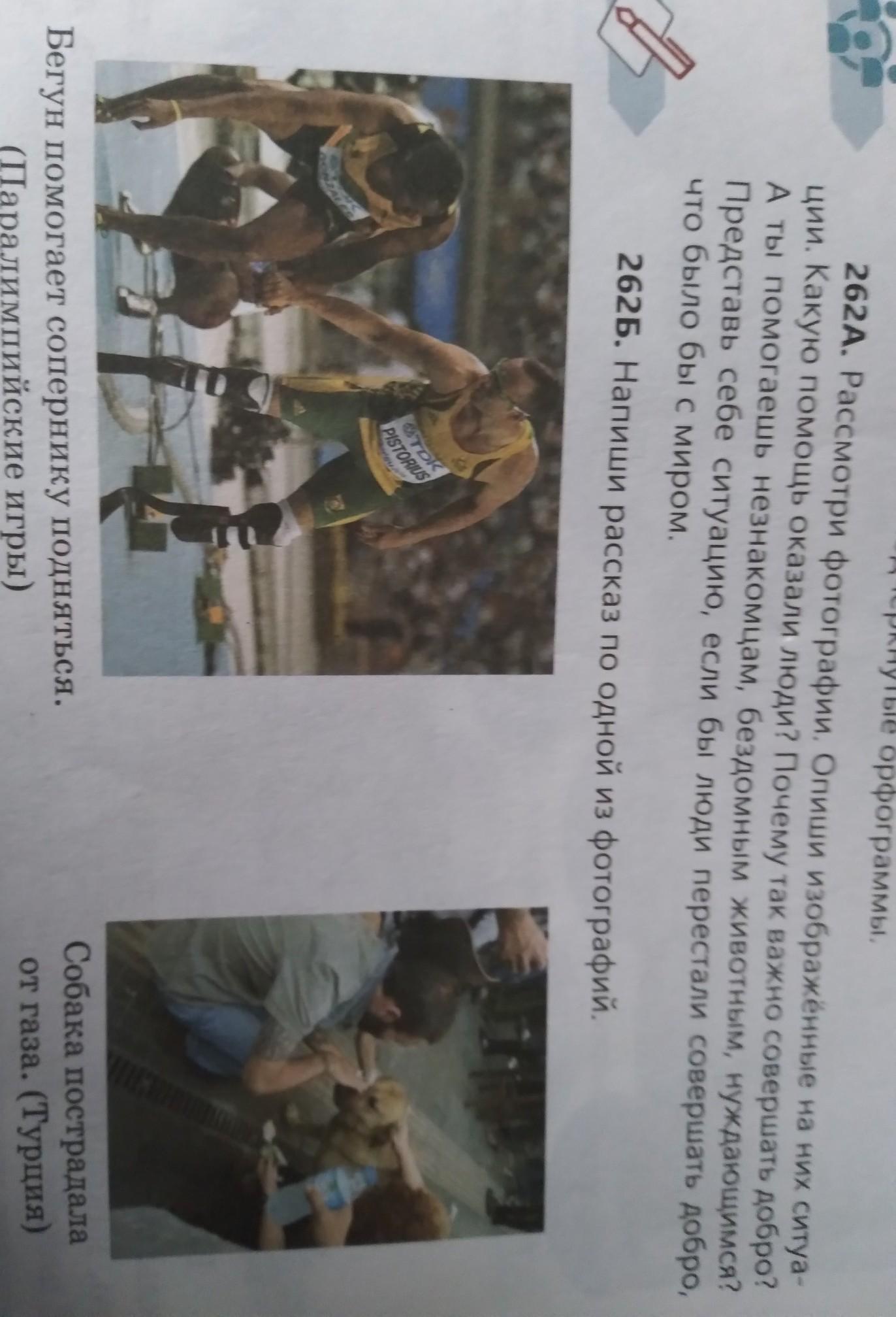 262A. Рассмотри фотографии. Опиши изображенные на них ситуа ции. Какую помощь оказали люди? Почему так важно совершать добро А ты помогаешь незнакомцам, бездомным животным, нуждающимся? Представь себе ситуацию, если бы люди перестали совершать добро. что было бы с миром. 262Б. Напиши рассказ по одной из фотографий, е Бегун помогает сопернику подняться. (Паралимпийские игры) Собака пострадала от газа. (Турция)