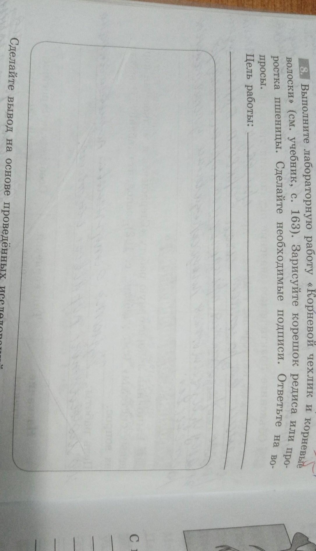 выполните лабораторную работу корневой чехлик и корневые волоски смотреть учебник страница 163 зарисуйте корешок редиса или просто к пшенице сделайте необходимые подписи Ответьте на вопросы цель работы сделайте вывод на основе проведённых исследований