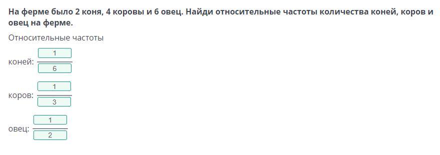 Абсолютная частота и относительная частота. Таблица частот. Урок 1 На ферме было 2 коня, 4 коровы и 6 овец. Найди относительные частоты количества коней, коров и овец на ферме. Относительные частоты коней: коров: овец: