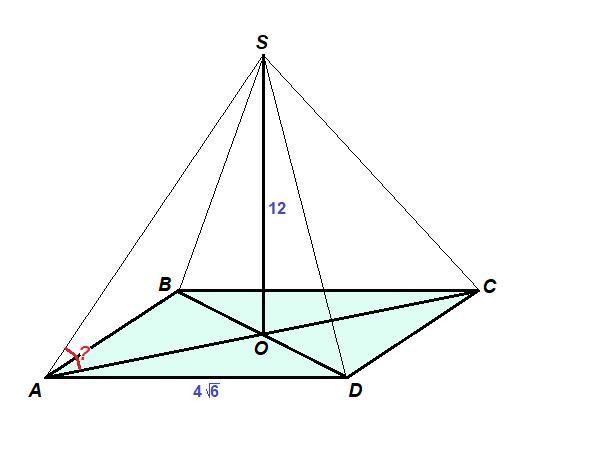 Задан квадрат ABCD со стороной, равной 4√6. Точка S равноудалена от вершин квадрата ABCD. Расстояние от точки S до плоскости квадрата равно 12 см. Найдите угол между прямой SA и плоскостью квадрата.