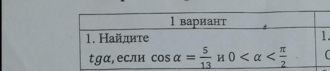 cosa=\dfrac{5}{13}\\\\\\\displaystyle sin^2a=1-cos^2a=1-\frac{25}{169}=\frac{144}{169}\ \ ,\ \ sina=\pm \frac{12}{13}\\\\\\0<a<\dfrac{\pi }{2}\ \ \ \Rightarrow \ \ \ sina>0\ \ ,\ \ sina=\frac{12}{13}\\\\\\tga=\frac{sina}{cosa}=\frac{12/13}{5/13}=\frac{12}{5}