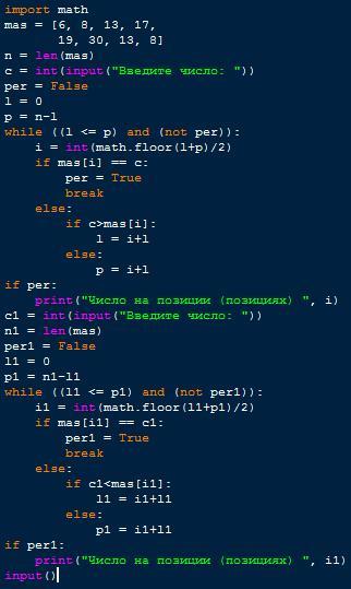 дано масив цілих чисел: 6,8,13,17,19,30,13,8. розробіть програму визначення всіх позицій,на яких знаходиться число, значення якого вводиться з клавіатури