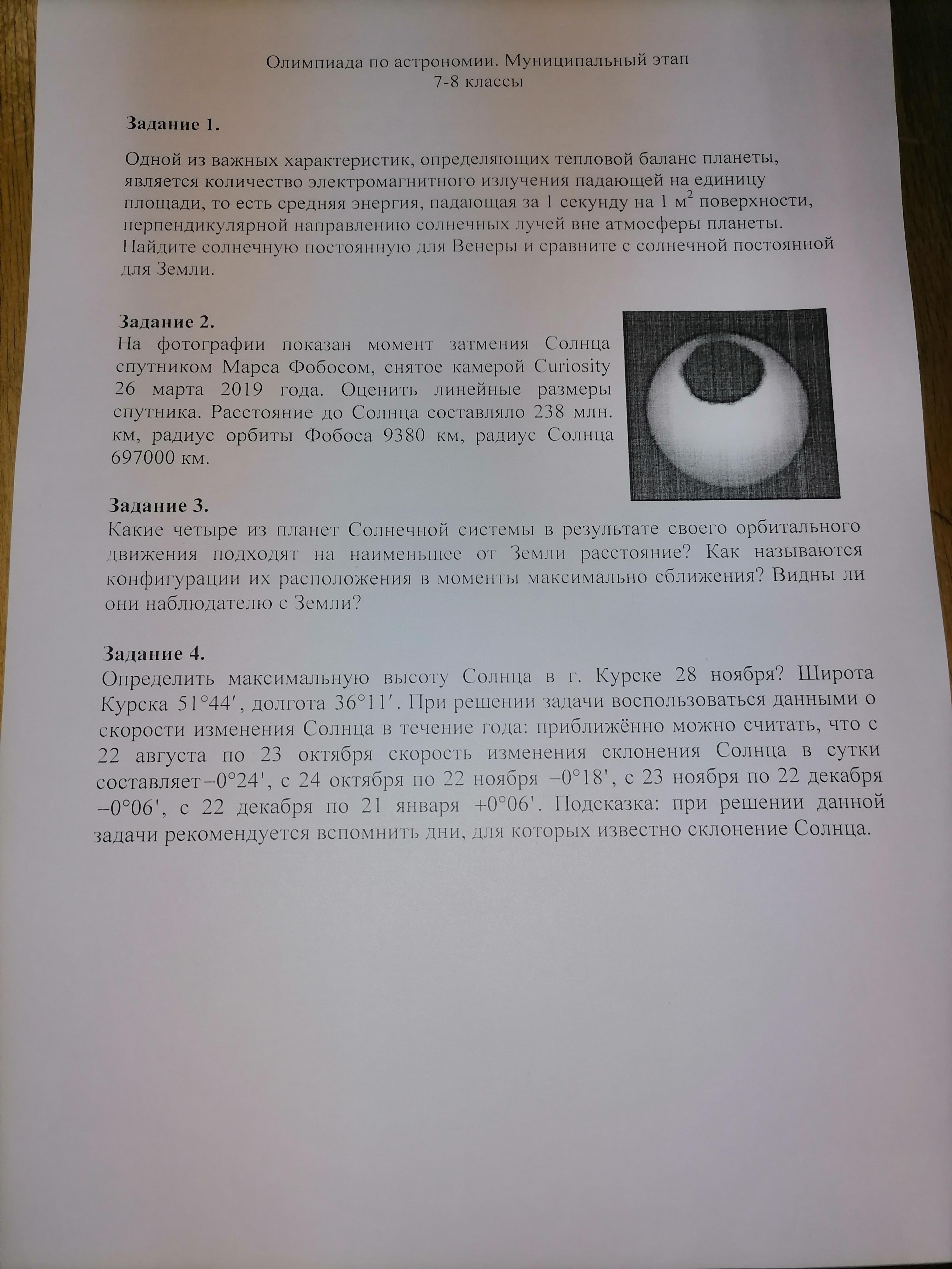 2) На фото угловой диаметр Фобоса, примерно в 2 раза меньше углового диаметра Солнца. Угловой диаметр Солнца на фото равен: dс'' = Dс*206265/S, здесь Dс - линейный диаметр Солнца = 2*697000км = 1,394*10^6 км;