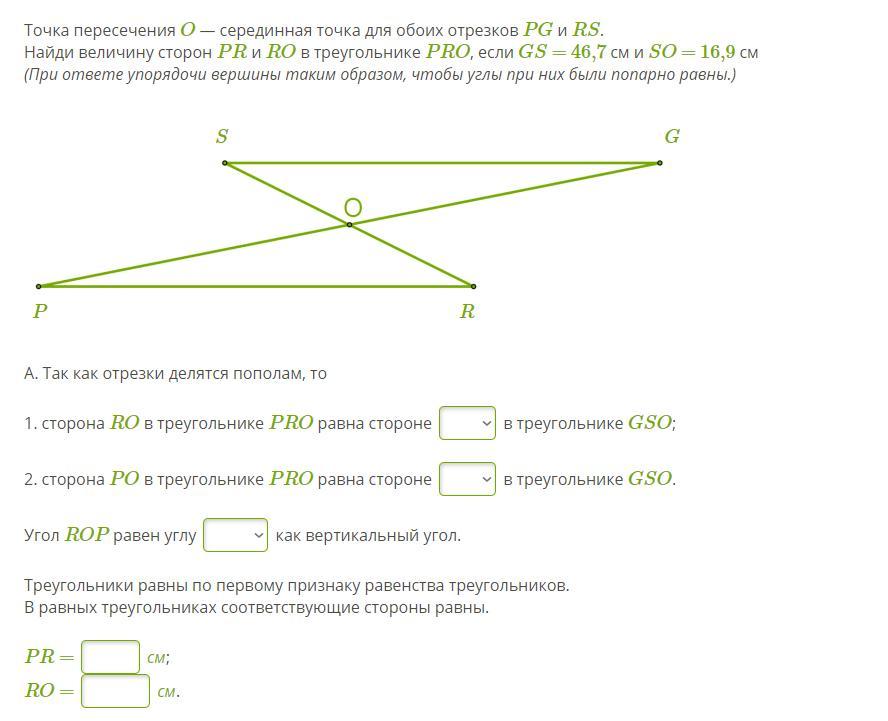 ДАЮ 60 БАЛЛОВ!!!!!!!!!!!!! Точка пересечения O — серединная точка для обоих отрезков PG и RS.