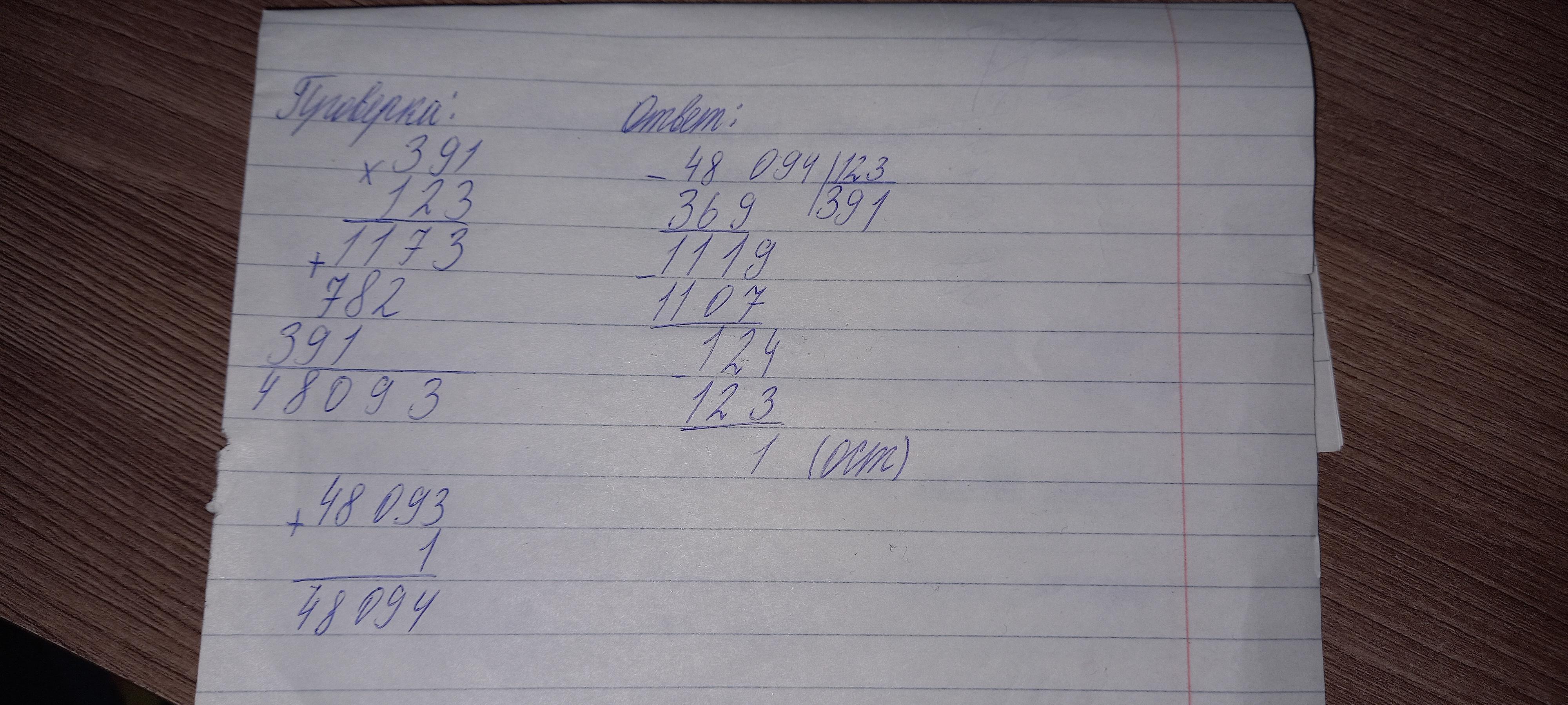 48094÷123 (с остатком, и с проверкой, столбиком)