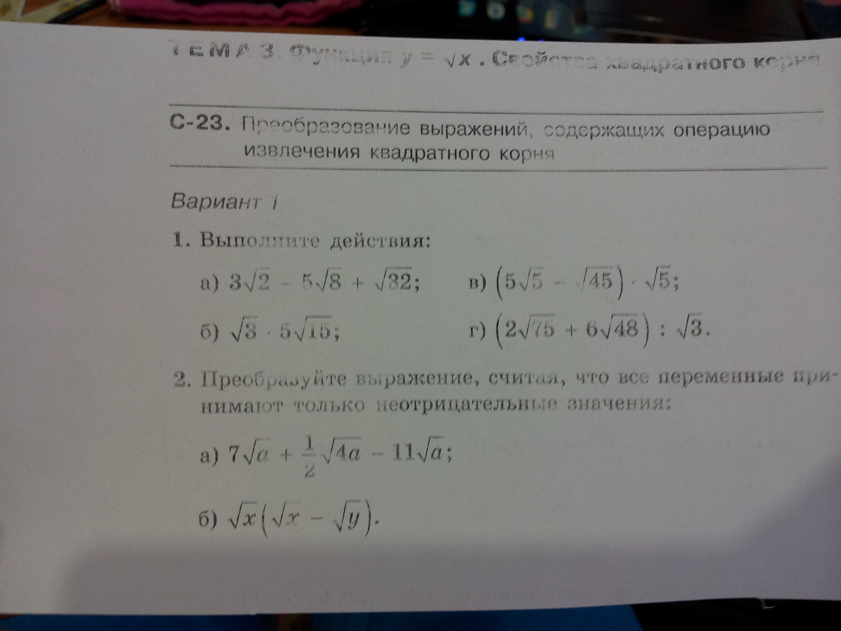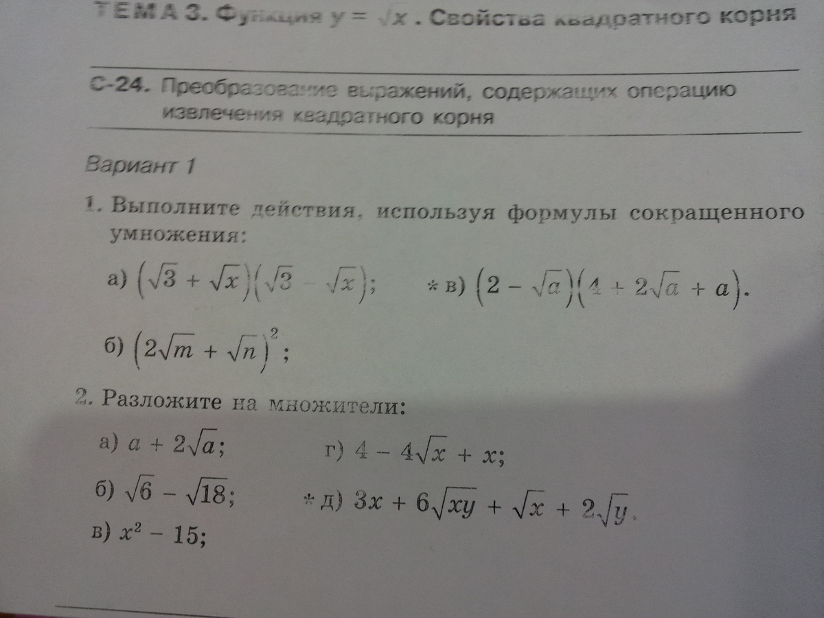 в)(5 корень из 5- корень из 45)* корень из 5=(5 корень из 5-3 корня из 5)* корень из 5=2 корня из 5* корень из 5=2 корня из 5