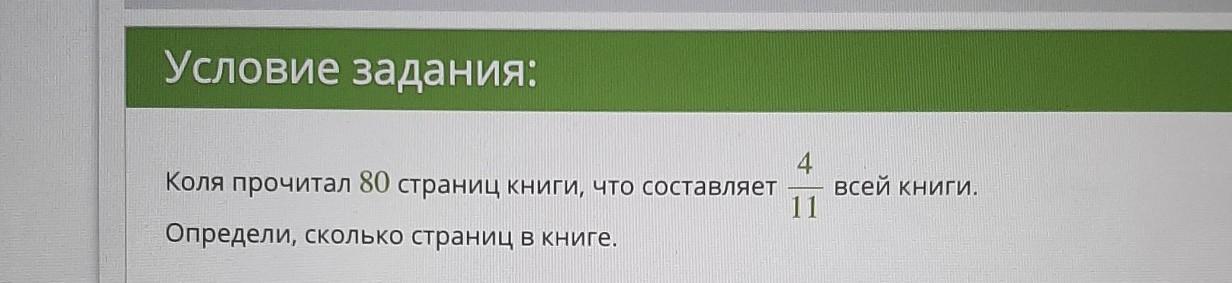 4 Коля прочитал 80 страниц книги, что составляет всей книги. 11 Определи, сколько страниц в книге. ОТВЕТ